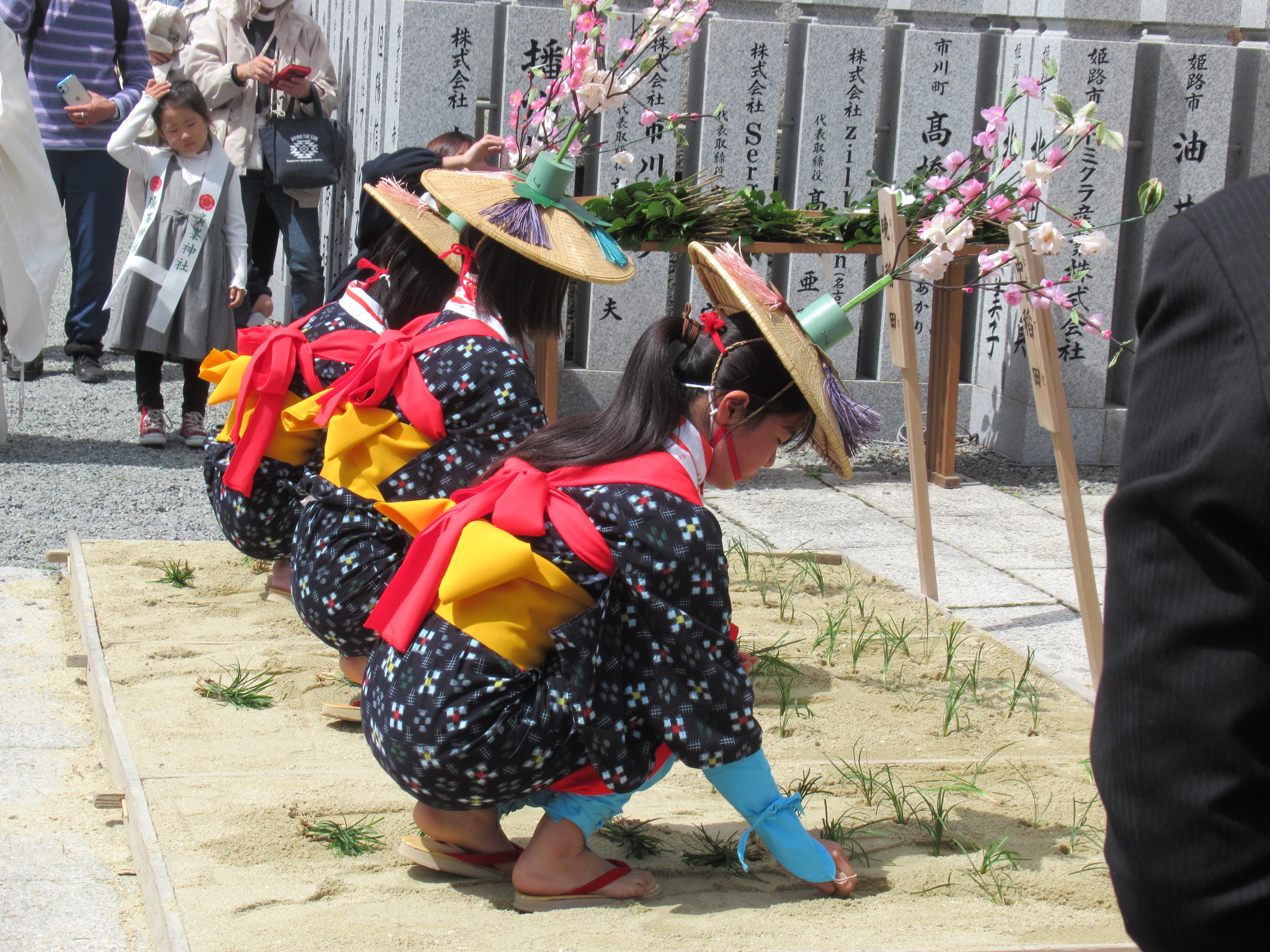 農耕の神として信こうされる廣峯神社では、毎年4月3日に本殿前の仮田を鍬(くわ)、代掻き(しろかき)で耕し、早乙女(さおとめ)が苗を植え付ける神事をおこないます。