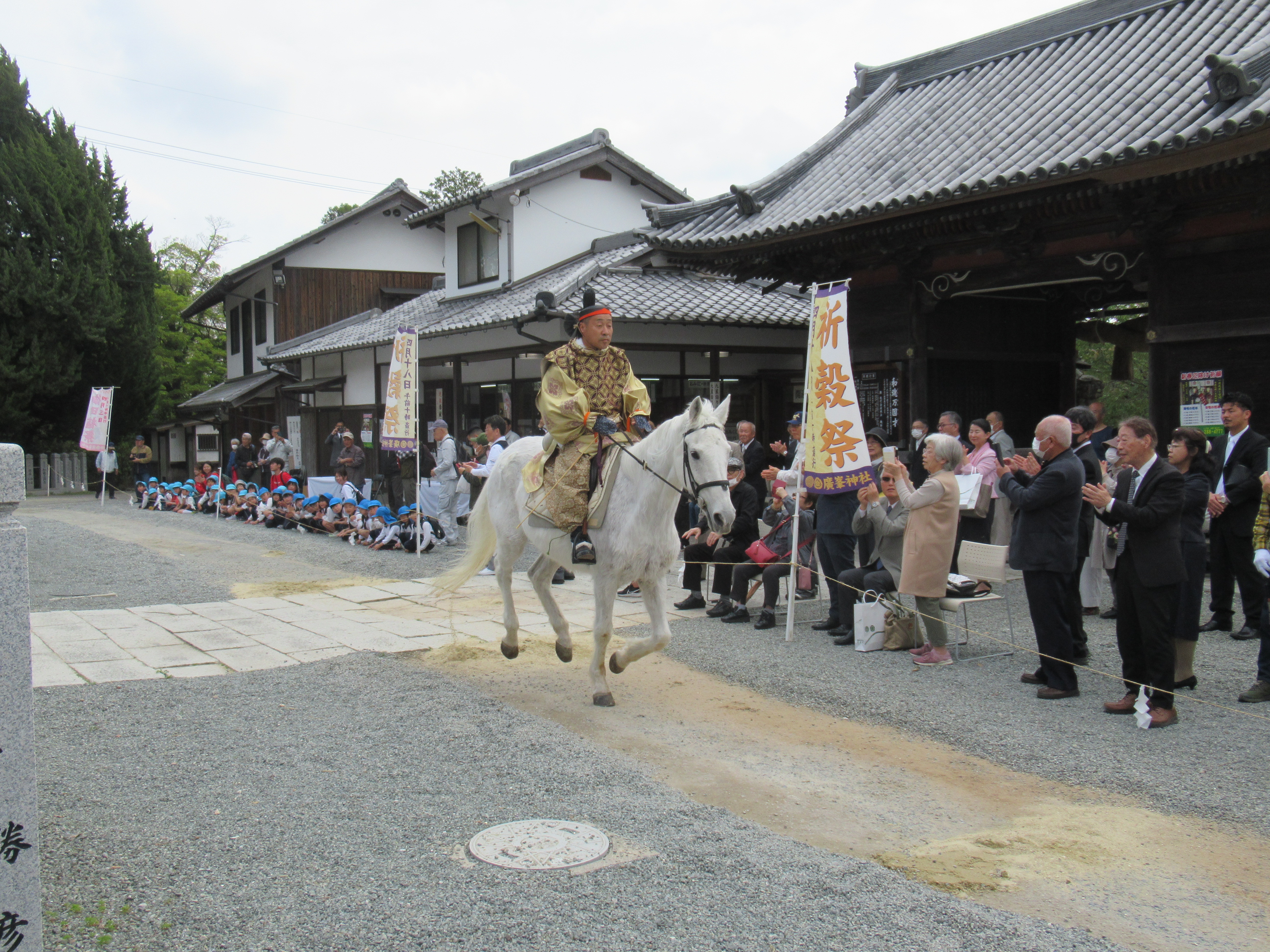4月18日には祈穀祭(きこくさい)がおこなわれます。祭りは、収穫した苗が供えられ、豊作をうらなう穂揃式(ほぞろいしき)・走馬式(馬がけ)がおこなわれます。