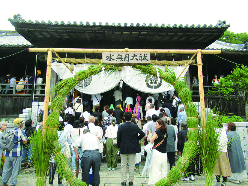 6月30 日には、夏越し(なごし)の大祓式(おおはらいしき)・茅の輪神事(ちのわしんじ)がおこなわれます。参拝者は、本殿の前に作られた大きな茅の輪(ちのわ)を、無病息災(むびょうそくさい)を願ってくぐります。