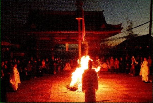 本殿前に5mの柱が立てられ、上部に日の丸扇(ひのまるせん) 、御幣(ごへい)などが飾られます。神事の後、御柱(おはしら)は炊き上げられ、 燃える柱がたおれた方角は来年の凶方位(きょうほうい)とされています。