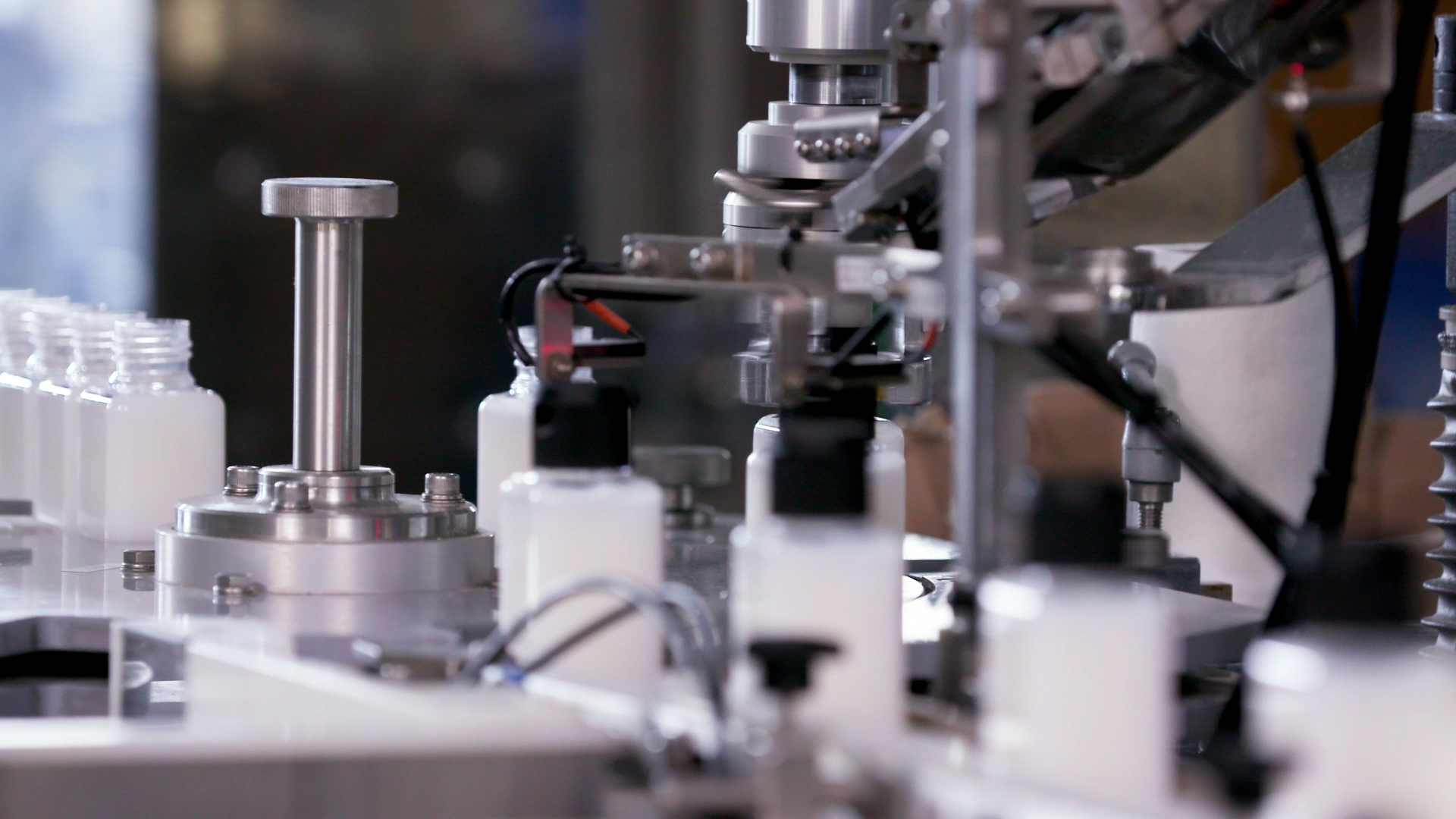 製造したメンテナンス製品を、オートメーションでボトルにつめていきます。ゆるみやもれのない均一化された製品供給を可能にしています。