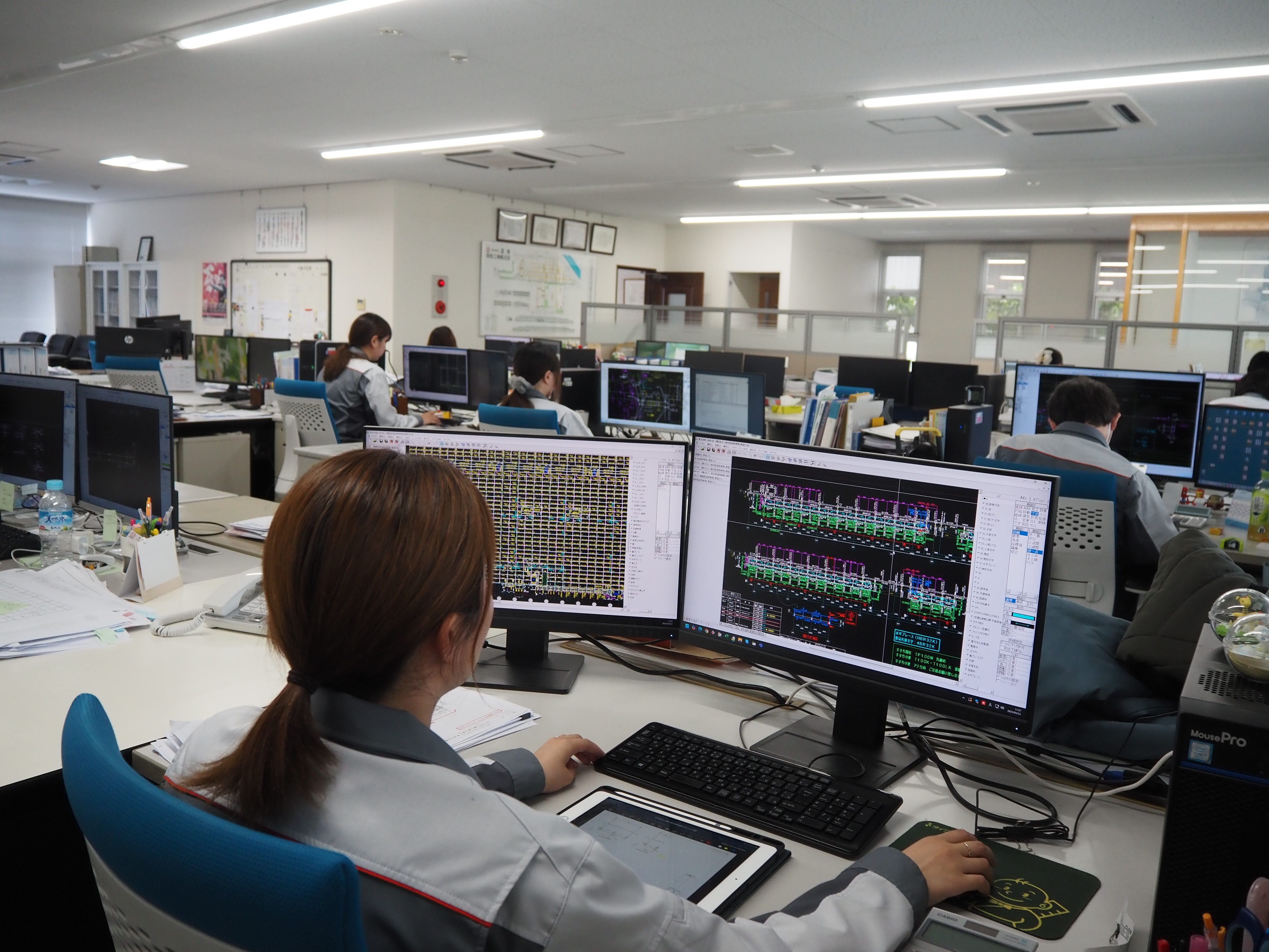 パソコンで設計などをするCADというシステムを使ってチームで設計をおこない、 安全性を追求しながらデザイン性、機能性をかね備えた設計を提案しています。