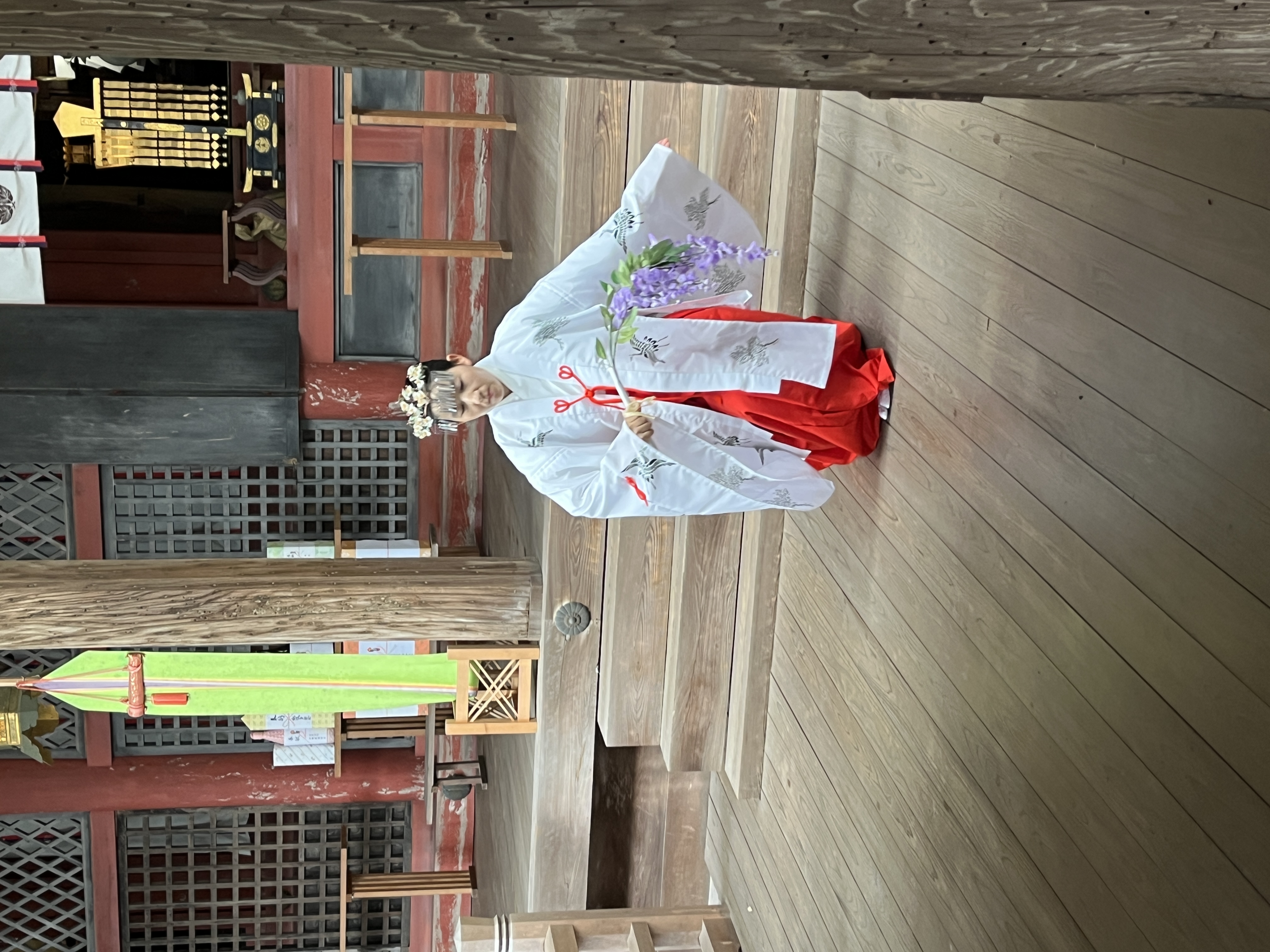 祭礼や神前結婚式で祝いの舞を奉納(ほうのう)します。神聖な祝いの時を感じていただけるよう、心をこめて踊ります。まちがえないよう、けいこは毎日おこないます。