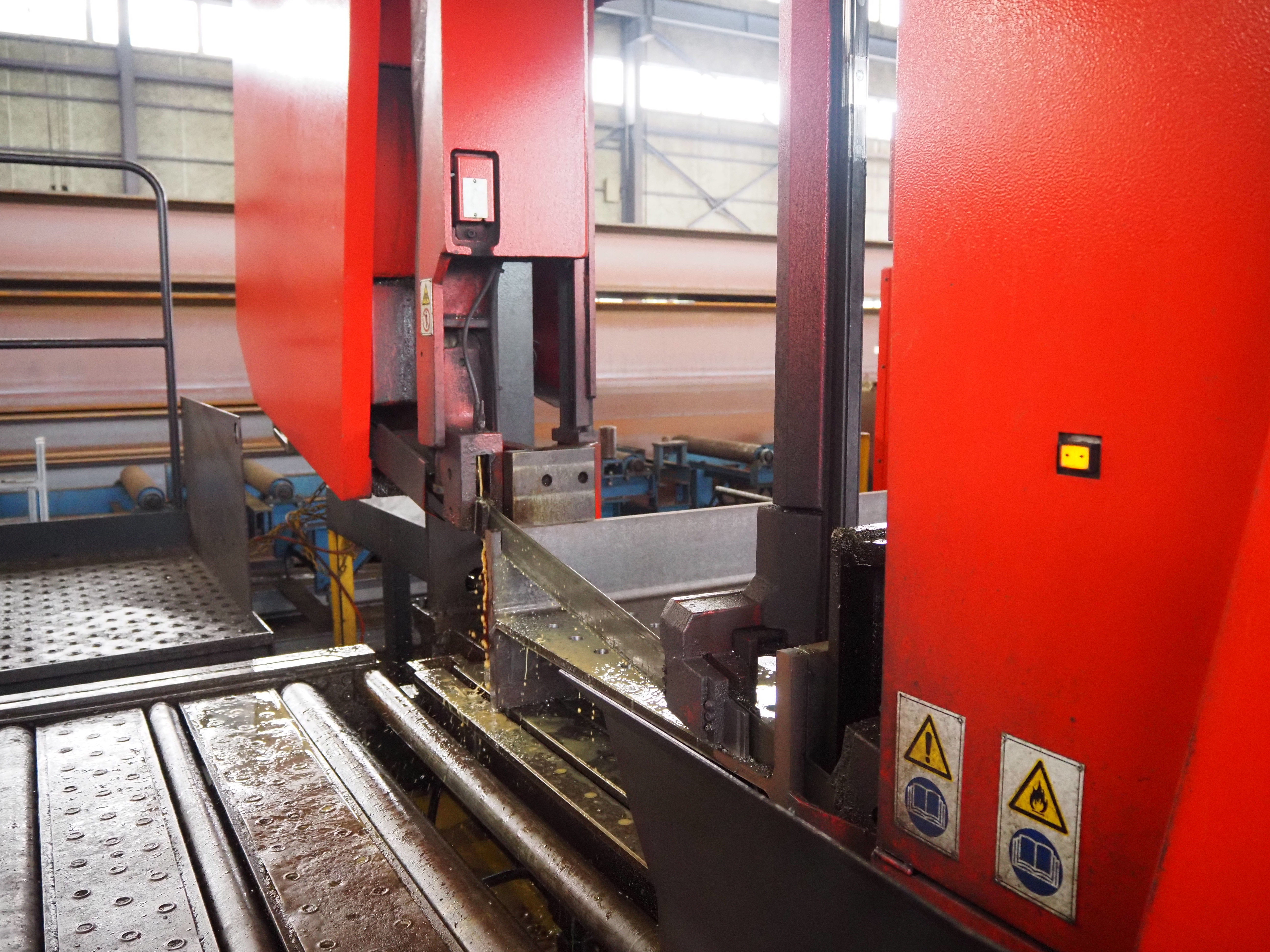 原材料の鉄骨を、孔あけ(あなあけ)・切断・表面処理など大型機械で 一次加工します。事務所と工場でデータを共有し、図面通りにミリ単位で仕上げられます。