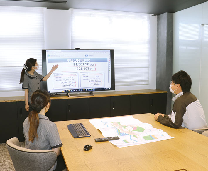 日々の発電量の変化などを、コンピュータで管理しています。発電量が少なくなったり、異常が出たりするとわかります。