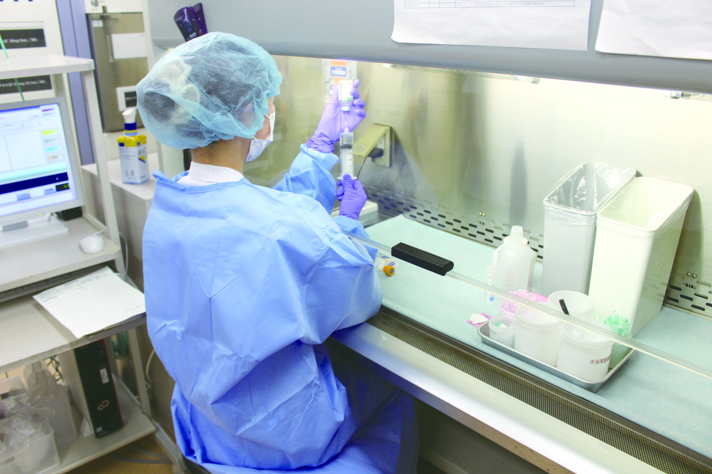 注射のお薬を針や注射器を使って調整します。お医者さんや看護師さんと患者さんの体調などを話し合いながら、患者さんが受けている点滴の成分や量を調整をすることもあります。