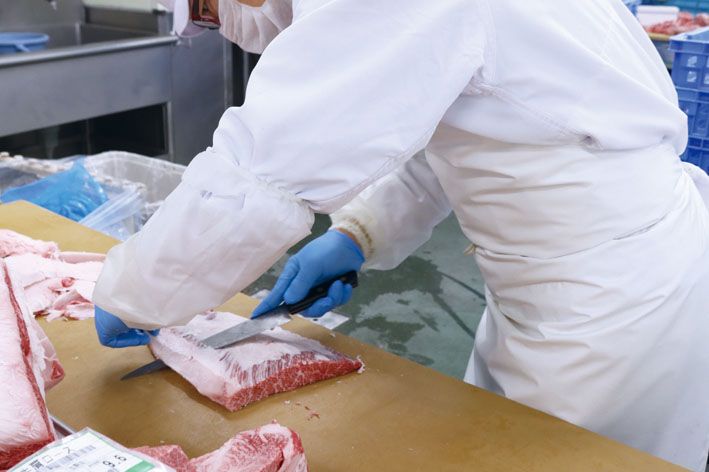 牛・豚・鶏肉の原体(部位ごとに分けられた肉のこと)を仕入れてステーキや焼き肉、しゃぶしゃぶ、から揚げなど、調理する用途によって機械や手でカットしたり、配送の仕分けをしたりして、デパートやスーパーマーケットに卸しています。原体は毎回形や大きさが違うため、筋や脂身の位置を考えながらカットしていきます。ほぼ毎回同じグラム数にカットできるのは経験がなせる職人技です。