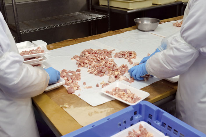 鶏肉には、他の肉に比べて、カンピロバクターという食中毒の原因となる菌が付着する恐れが高く、取り扱いには細心の注意を払って作業をおこなっています。