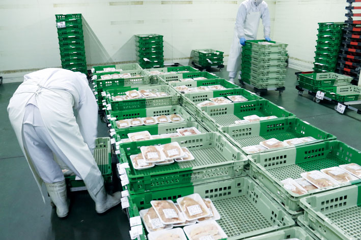 パックに入れた肉は、商品と小売店ごとに値札を貼り付け仕分けします。配送する前に個数や商品に間違いが無いか最終チェックをおこないます。