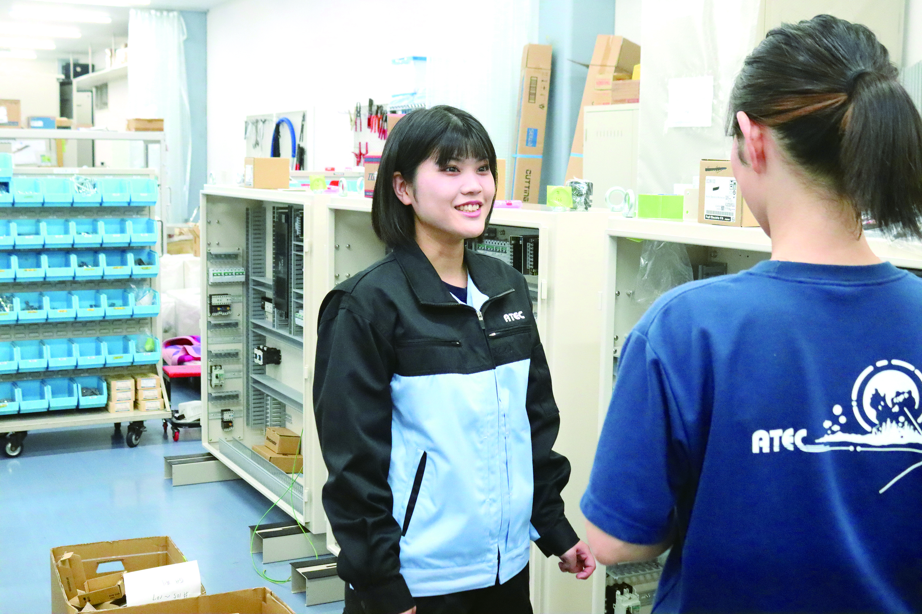 わたしたちが作っている[制御盤]は、いろいろな機械を動かしています。たとえば、遊園地の乗り物や工場のロボット、駐車場のゲートなど、皆さんのくらしを便利にしたり、安心、安全に生活したりすることにとても役に立っています。また、危険な仕事は人の代わりにロボットがすることがあります。そのロボットが働くために正確なプログラミングをしています。わたしたちの技術は、くらしやすい未来につながっています。