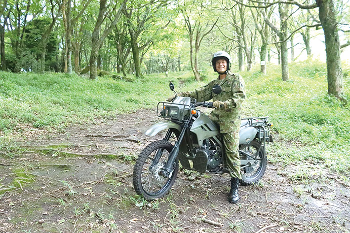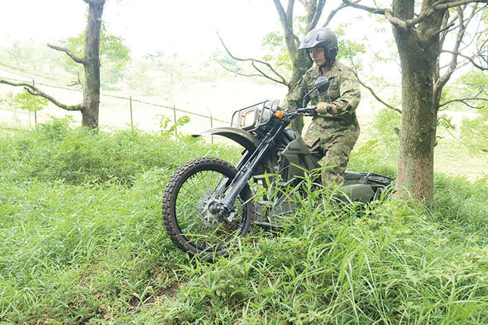 偵察手は道なき道を進み、情報を集めなければいけません。荒れた山林や被災地でも自在にオートバイをあやつれるように、隊員は日ごろから訓練を欠かしません。