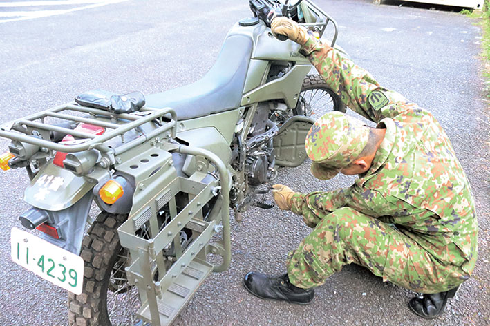 偵察用バイクは荒れた地形などを自在に走る、いわばわたしたちの足であり、大切なパートナー。いつでも出動ができるように、愛情を込めて整備・点検をおこたりません。