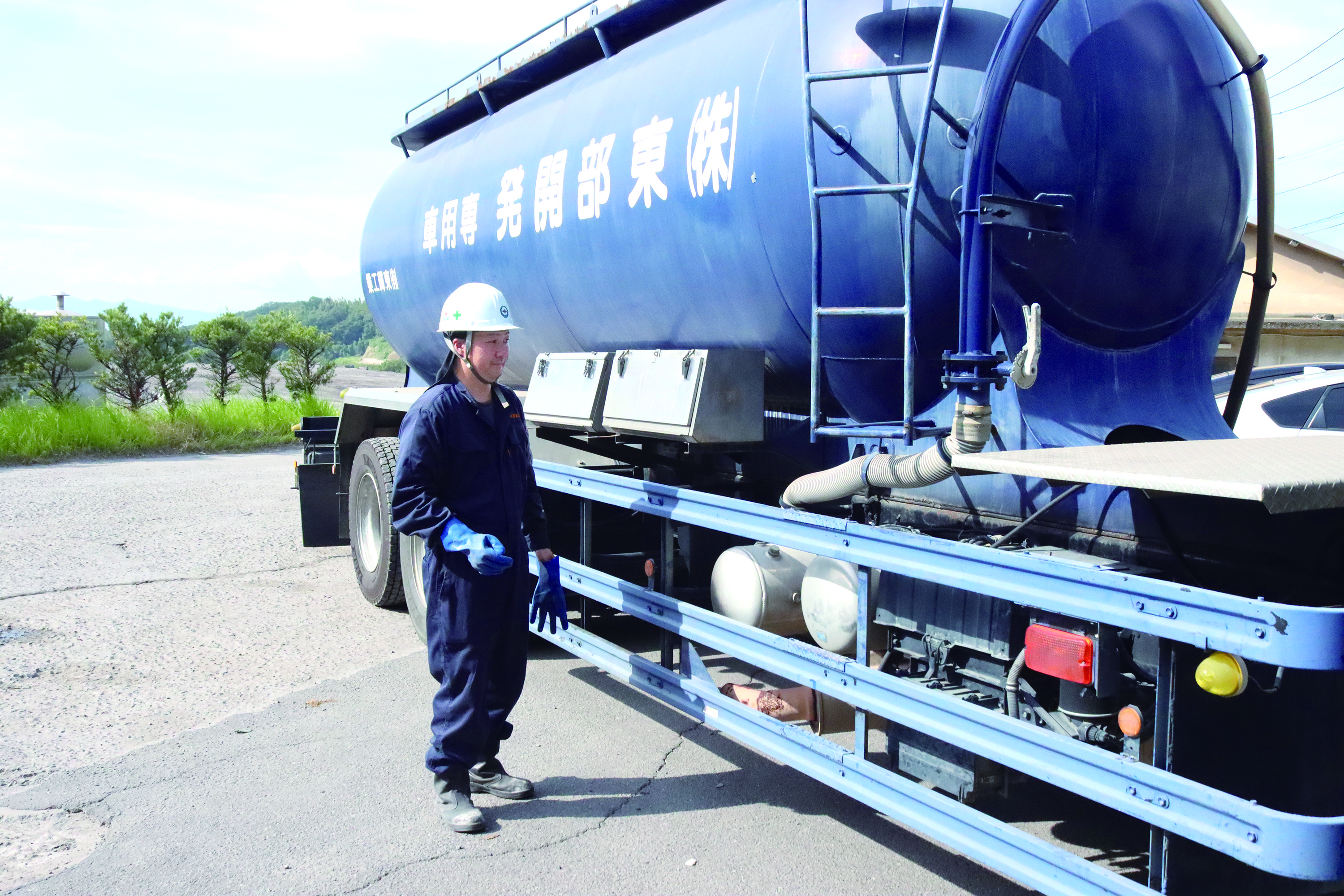 工場で出たボイラー焼却灰を引き取り、運ぱん車で運びます。リサイクル工場設備に焼却灰を投入する時は、配管が熱くなっているのでやけどなどに注意します。