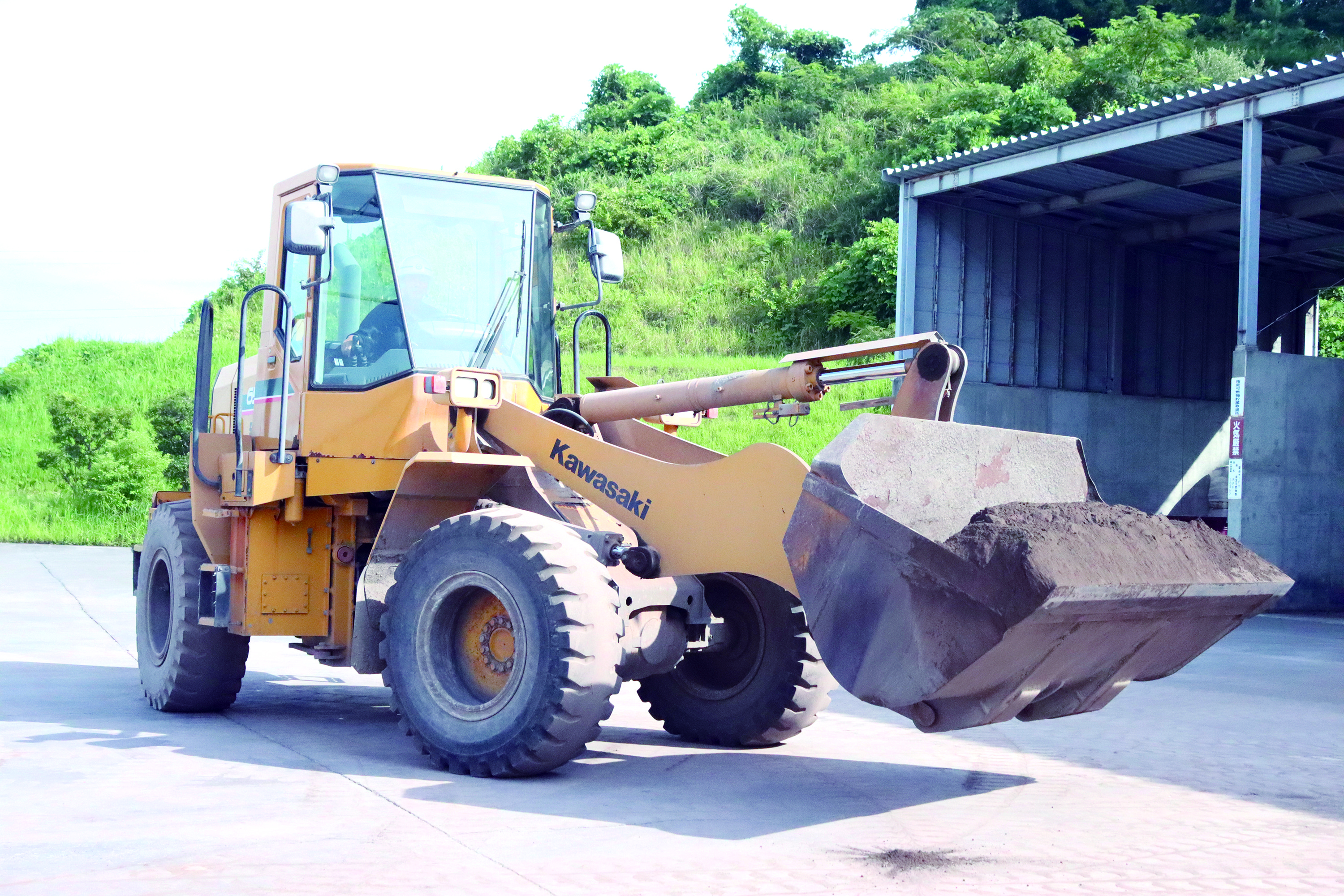 完成した土壌改良材をタイヤショベル車で運ぱん車に積みこみます。積みこんだ土壌改良材は注文をいただいている取引先に納品をします。